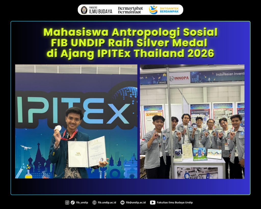 FIB UNDIP – Prestasi membanggakan ditorehkan oleh mahasiswa Program Studi Antropologi Sosial Fakultas Ilmu Budaya Universitas Diponegoro. Muhammad Keane Farrel Abbas, mahasiswa Antropologi Sosial angkatan 2023, berhasil meraih Silver Medal pada ajang Bangkok International Intellectual Property, Invention, Innovation and Technology Exposition (IPITEx) Thailand Inventors Day 2026 bersama tim lintas disiplin dari Universitas Diponegoro (Tim Insani).
