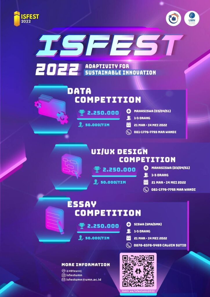ISFEST 2022 merupakan acara kompetisi nasional yang terbuka untuk Mahasiswa/i dan pelajar SMA/SMK. Pada ISFEST 2022, terdapat beberapa kompetisi yang terbagi menjadi kompetisi akademik dan non-akademik. Kompetisi akademik meliputi UI/UX Competition, serta Data Competition dan kompetisi non-akademik meliputi turnamen Mobile Legends dan Valorant. Acara ISFEST 2022 akan dilaksanakan pada tanggal 27 Juni 2022 s.d. 2 […]