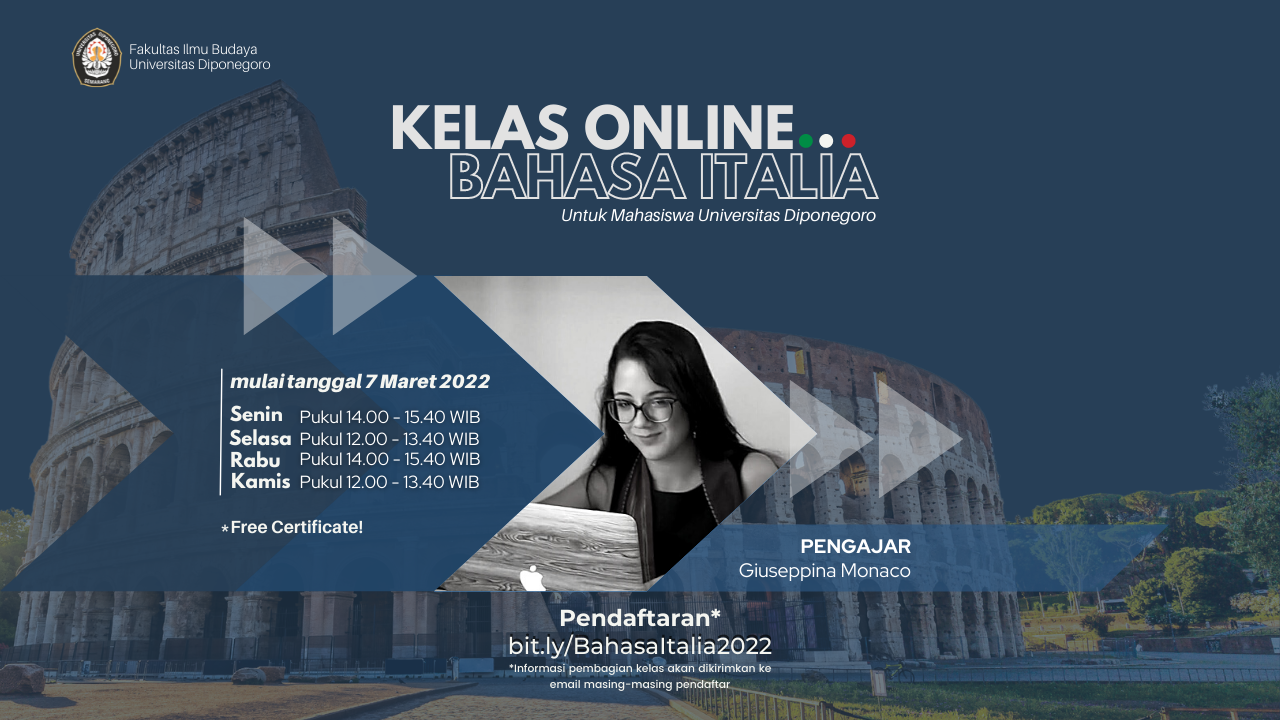 Fakultas Ilmu Budaya Universitas Diponegoro membuka pendaftaran kelas Bahasa Italia bagi Mahasiswa Universitas Diponegoro untuk Semester Genap Tahun Akademik 2021/2022. Kelas Bahasa Italia akan dimulai
