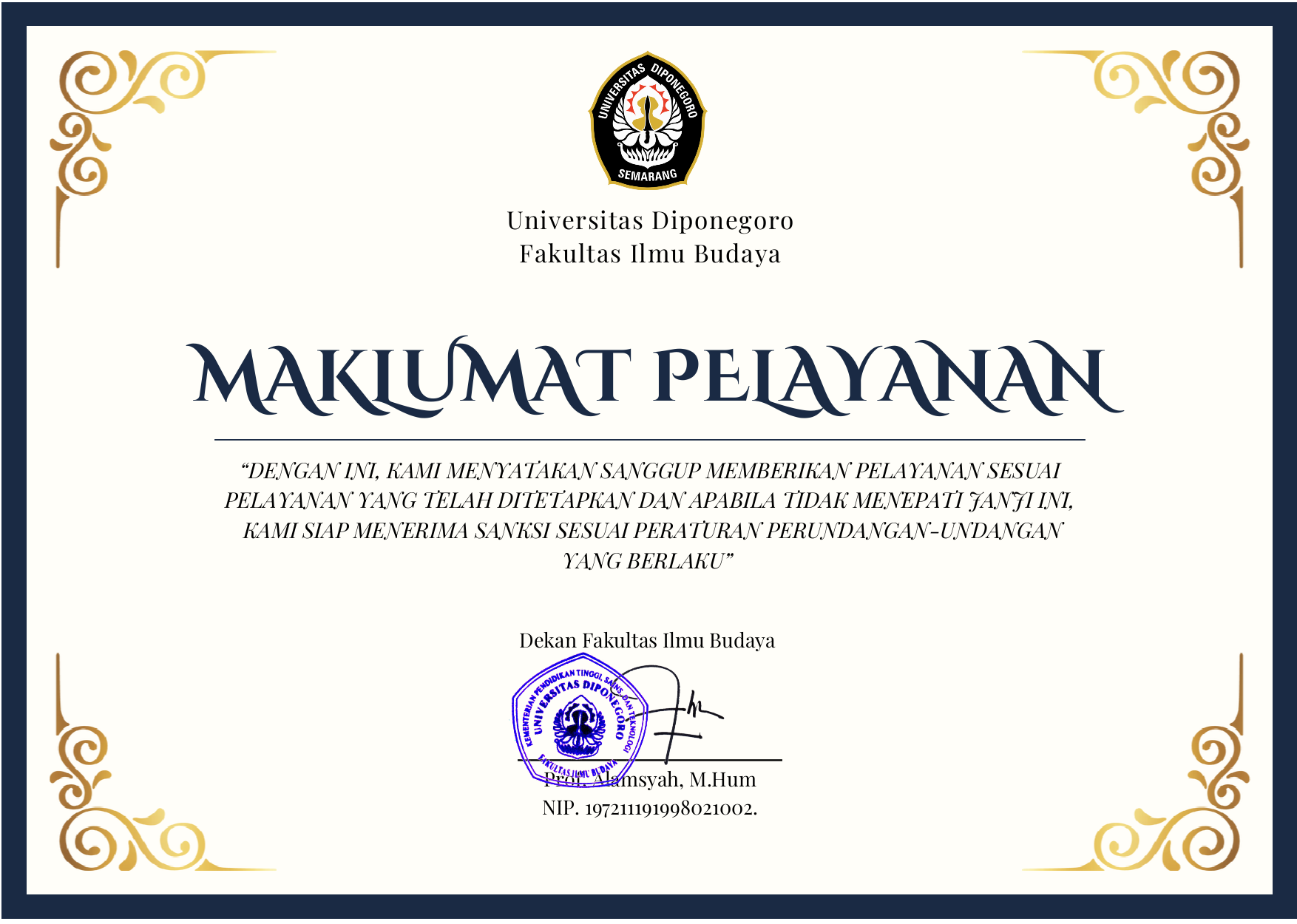 Sosialisasi Zona Integritas (ZI) Fakultas Ilmu Budaya Undip Semarang (2/7/2024), Fakultas Ilmu Budaya, Universitas Diponegoro (FIB Undip) mengadakan acara sosialisasi zona integritas di lingkungan FIB Undip. Adapun tema yang diangkat yakni “Pengalaman Fakultas