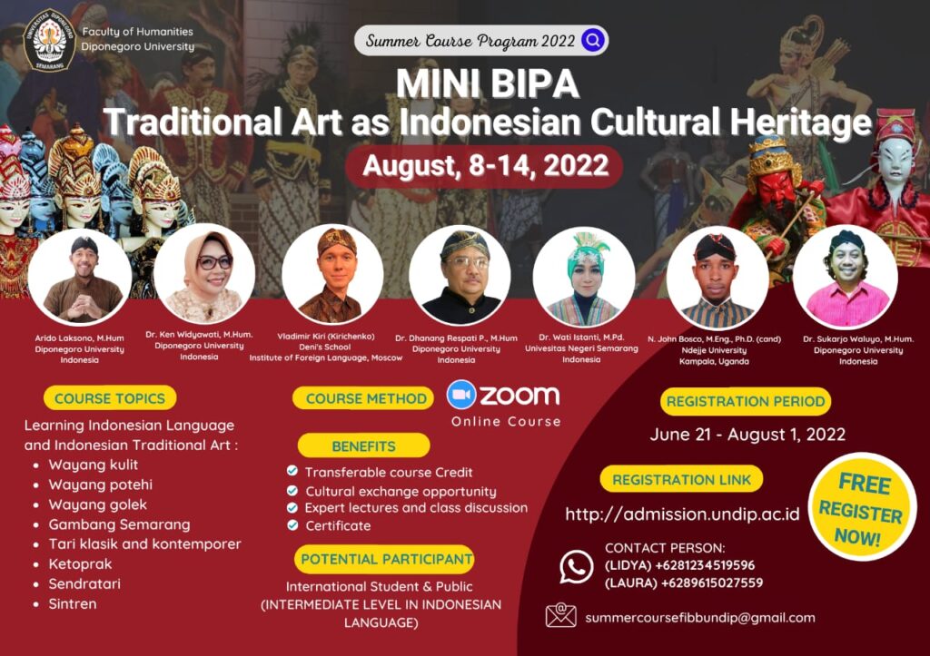 Fakultas Ilmu Budaya Universitas Diponegoro Mempersembahkan: Summer Course Program 2022 Summer Course Program 2022 dari FIB Undip dibuka untuk umum dengan tema “MINI BIPA: Traditional Art as Indonesian Cultural Heritage” yang akan diselenggarakan pada tanggal 8-14 Agustus 2022. Topik yang akan ditawarkan adalah seputar Learning Indonesian Language and Indonesian Traditional Art dengan pemateri sebagai berikut: Arido Laksono, S.S., […]